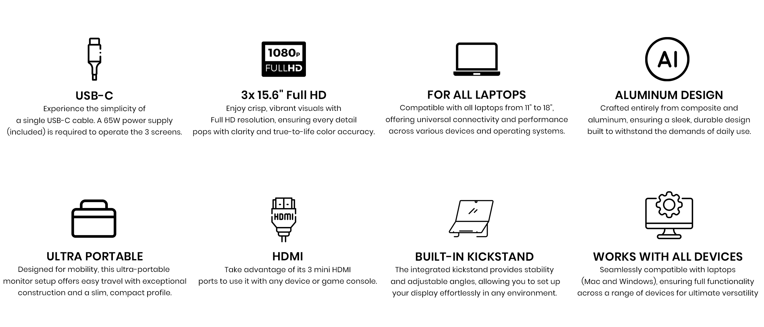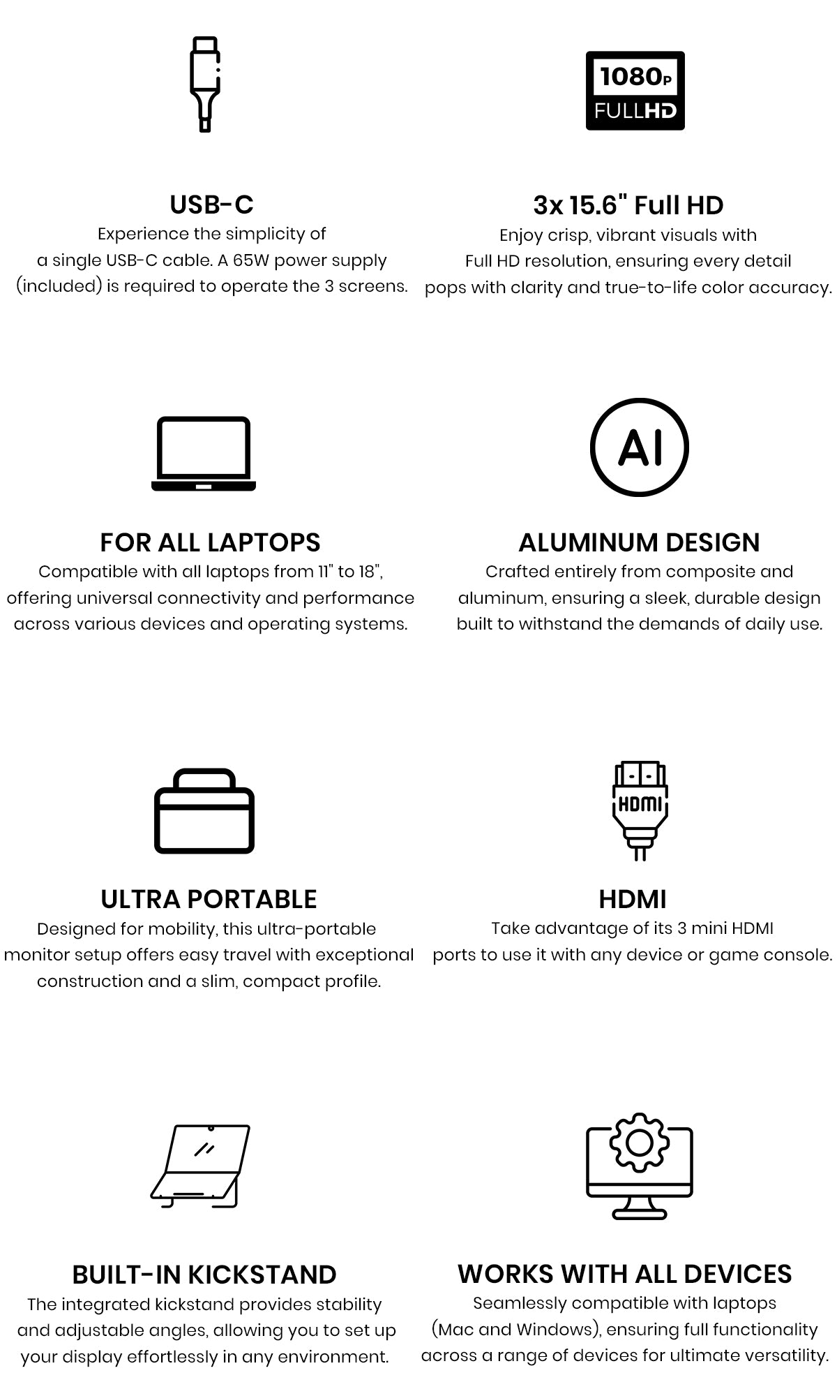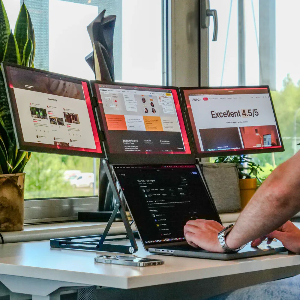 Introducing the Triple Aero 15.6" Pro Max, the ultimate cockpit-style productivity booster. Crafted from premium aluminum accents, it features three 15.6-inch Full HD anti-glare monitors. It connects with USB-C to your laptop. A 65W power supply (included) is required to operate the 3 screens. Perfect for professionals on the move.