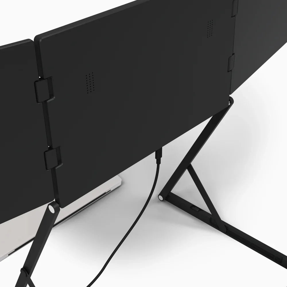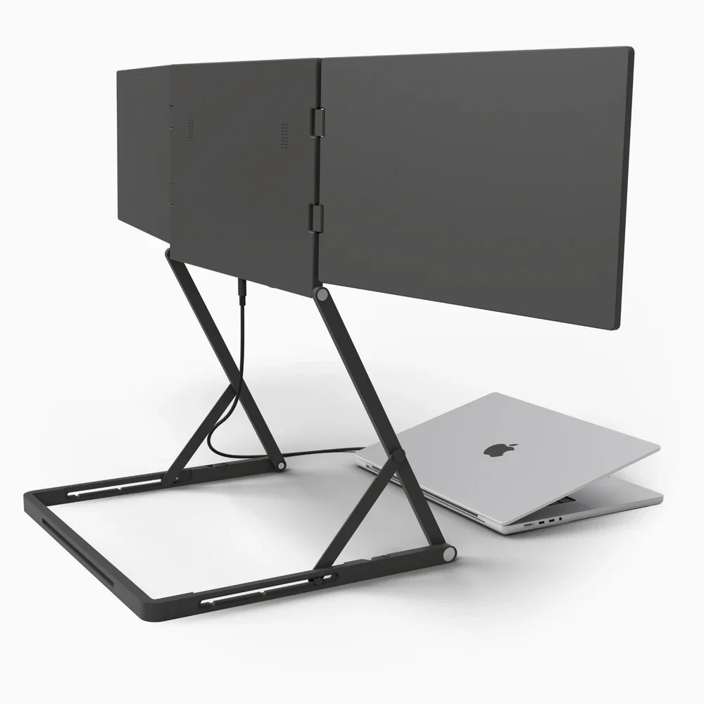 Built with precision-engineered hinges, the entire device adapts effortlessly to your workflow. Both the structure and each screen tilt forward or backward and adjust to multiple height levels ensuring perfect alignment with any laptop setup.