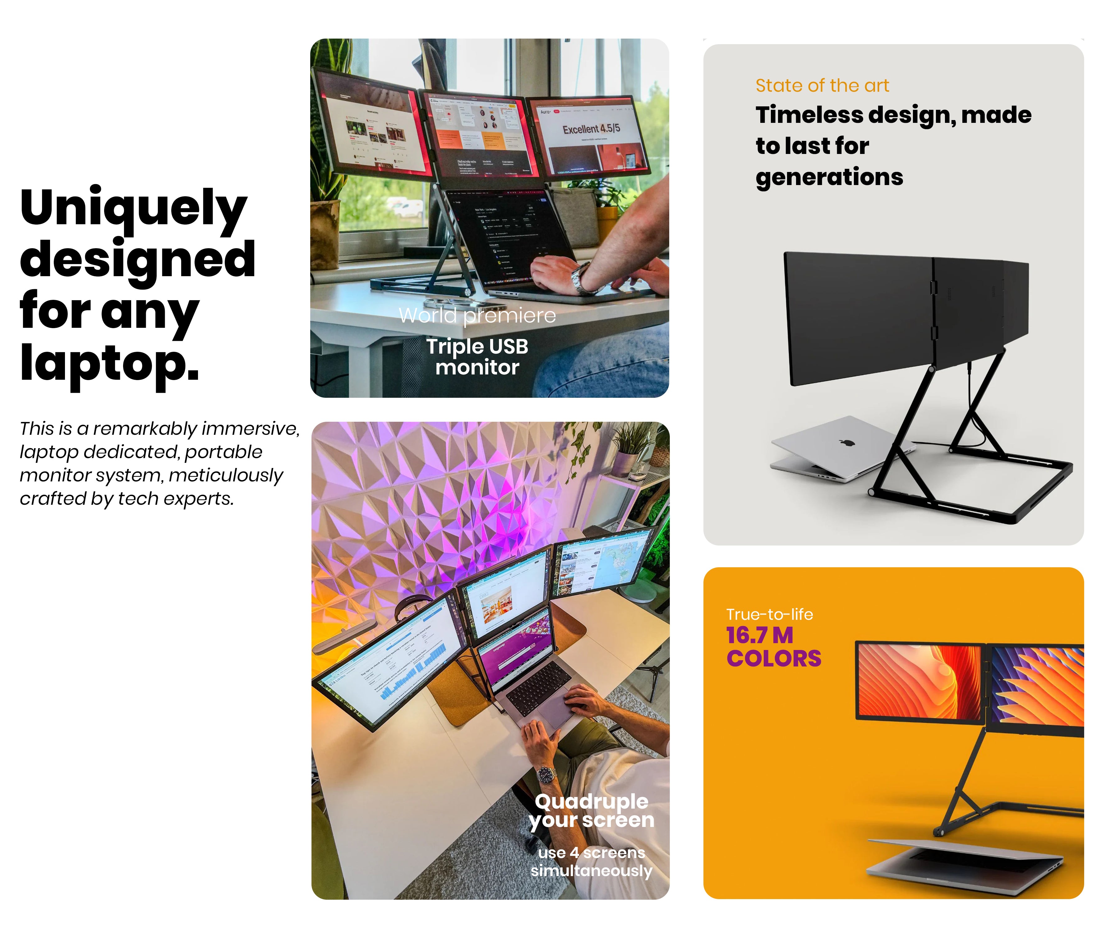 Expand your laptop with three extra 15.6" monitors. It connects with USB-C to your laptop or 3 mini-HDMI (if your laptop/desktop supports it). A 65W power supply (included) is required to operate the 3 screens.